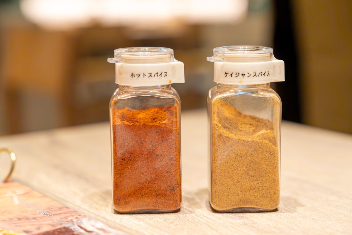 卓上には辛さを追加できる「ホットスパイス」と、風味やコクを足せる「ケイジャンスパイス」が置いてありました。自分好みに味変できるのはうれしいポイントですね。