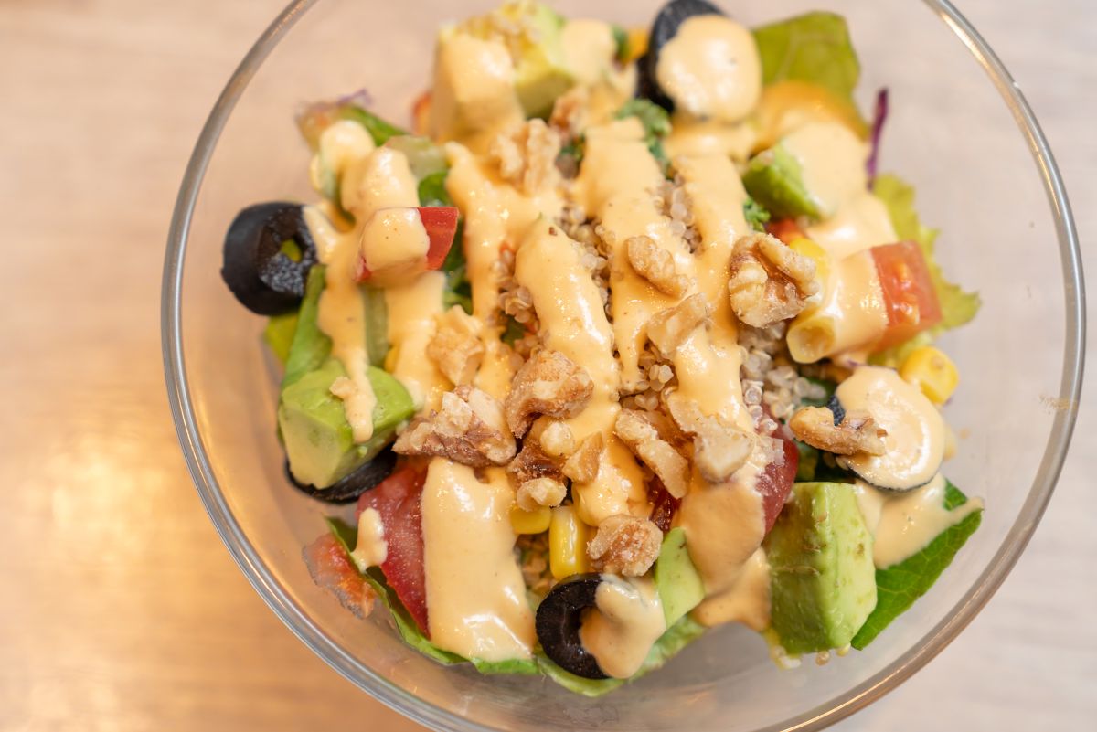 「RUCY+R」はサラダも自慢のメニューのひとつ。「お野菜たっぷり玄米のあいがけカレーセット」に付いてくるのは「10品目のミネラルサラダ」。小さめのサイズながら、スーパーフードのキヌアを含む10種の野菜をしっかり食べられるお得なセット。サラダは自家製の手作りドレッシング4種の中からひとつ選べるのもポイント。ドレッシングは「クリーミーナッツ」「スパイシーサウザン」「和風オニオン」「柚子キャロット」の4種。取材時は一番人気の「クリーミーナッツ」をチョイスしました。ナッツの香りがアクセントとなった濃厚ドレッシングで、サラダがよく進みます(セットサラダのドレッシングはクリーミーナッツのみ)。