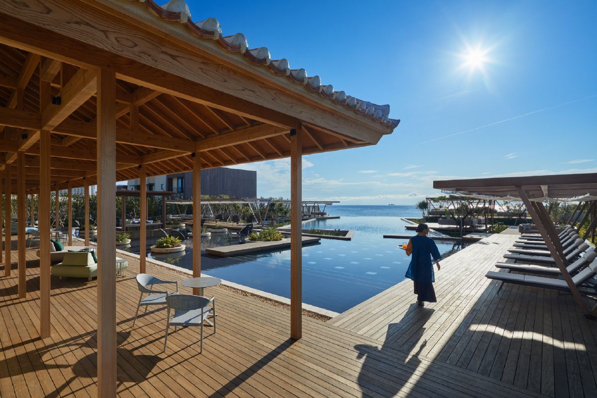 会場は世界的なアワードのJapan Hotel Pools部⾨で1位を受賞したプールサイド。⼼地よい海⾵と波⾳が渡る午後のプールサイドでは、陽光がきらめく⽔⾯を眺めたり、浅瀬のエリアで⽔と戯れたり、優雅な時間が過ごせます。
