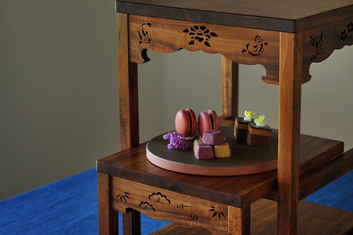「海風アフタヌーンティー」の大きな特徴の一つが、沖縄で植栽されている常緑樹・相思樹(そうしじゅ)で作られたティースタンド。王朝時代からお祝い事やもてなしに⽤いられている牡丹、オナガドリなどの彫りが施された星のや沖縄オリジナルのティースタンドです。