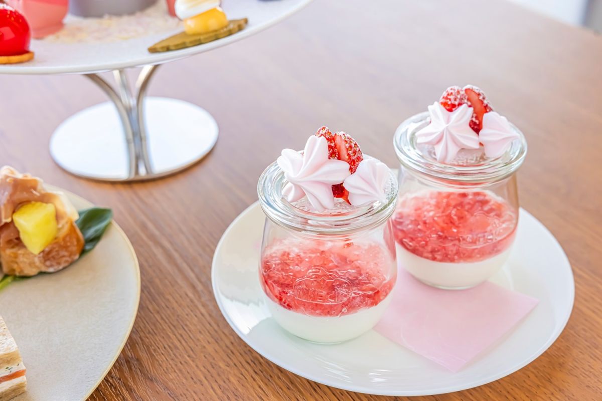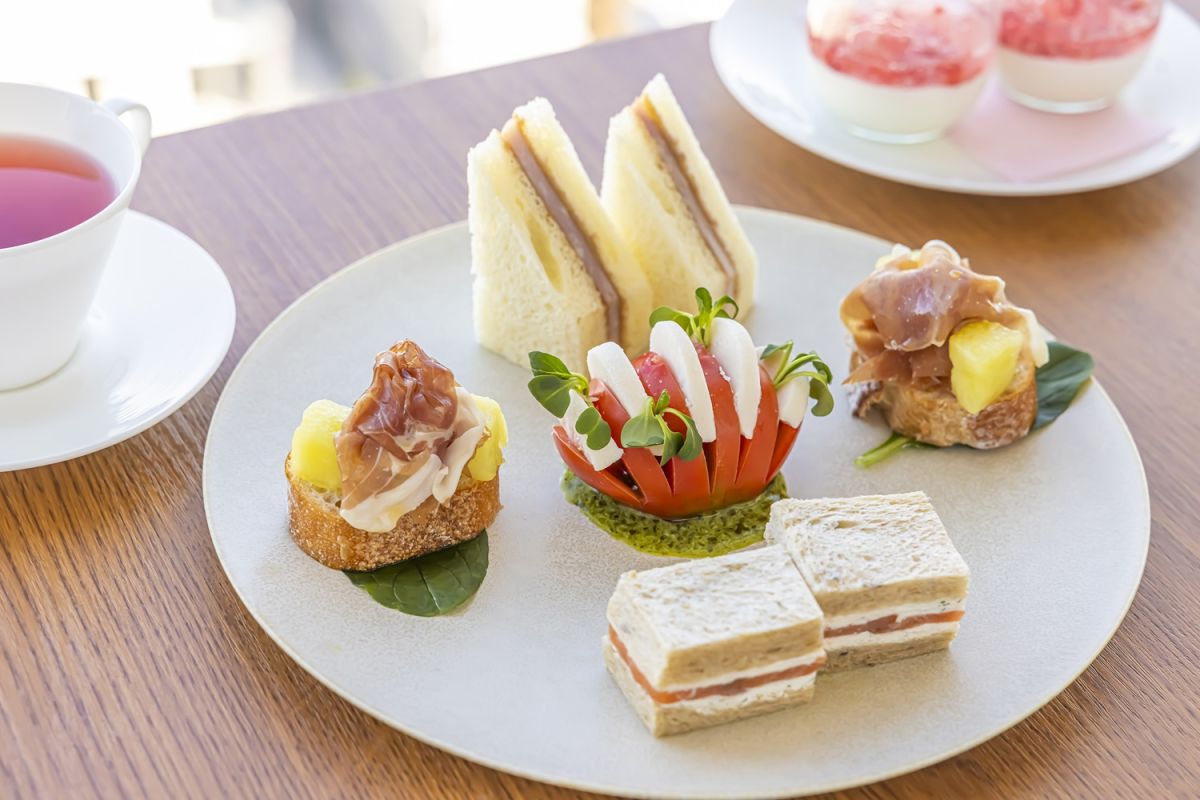 セイボリープレートは、「エクセルシオールホテル・ガリア」でエグゼクティブシェフを務めるレバノ兄弟のレシピで作るハムとピーナッツバターのサンドウィッチや生ハムとメロンのバゲットなどを用意。グラススイーツでは桜とストロベリーのパンナコッタを楽しむことができます。