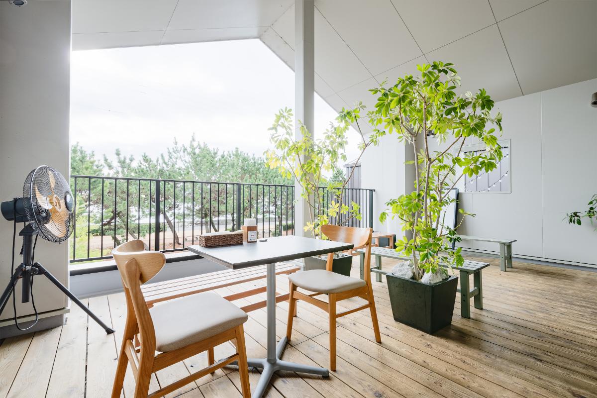 お天気に恵まれたら、木々の向こうに海を望むテラス席もおすすめ。燦々と差し込む日差しのもと、心地良い海風を感じることができますよ。