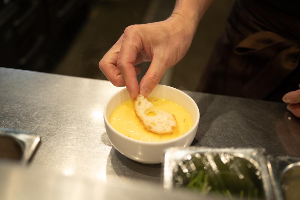 チーズと卵黄、生クリームをスープで割ったつけ汁は、これ以上なく濃厚な味わい。たっぷりの煮干しと昆布を中心にひいた出汁をベースに、乾燥ポルチーニなどの隠し味がアクセントとなっています。