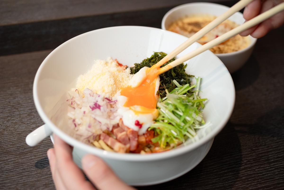 少しずつ崩しながら食べるのはもちろんのこと、麺と具材を一気に混ぜてつけ汁にとろりと絡め、豪快に食べるのもおすすめ。ベーコンに紫玉ねぎ、水菜や温泉卵など、崩すのがもったいないほど美しい一皿ですが、ひと思いにいただきます。
