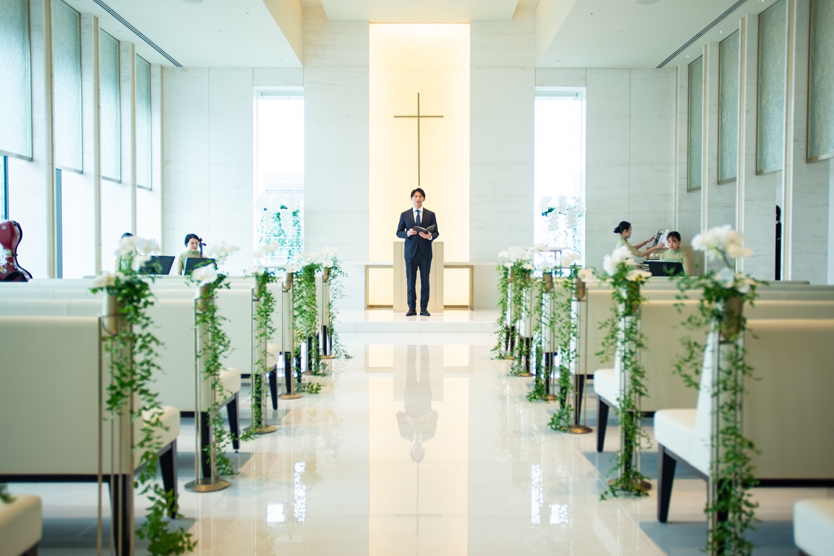 今回は特別に、ロビー以外の場所にもご案内いただけることに。その一つがこちらのスカイチャペル。プレステージタワー41階にあり、当日は人前式のリハーサルが行われていました。