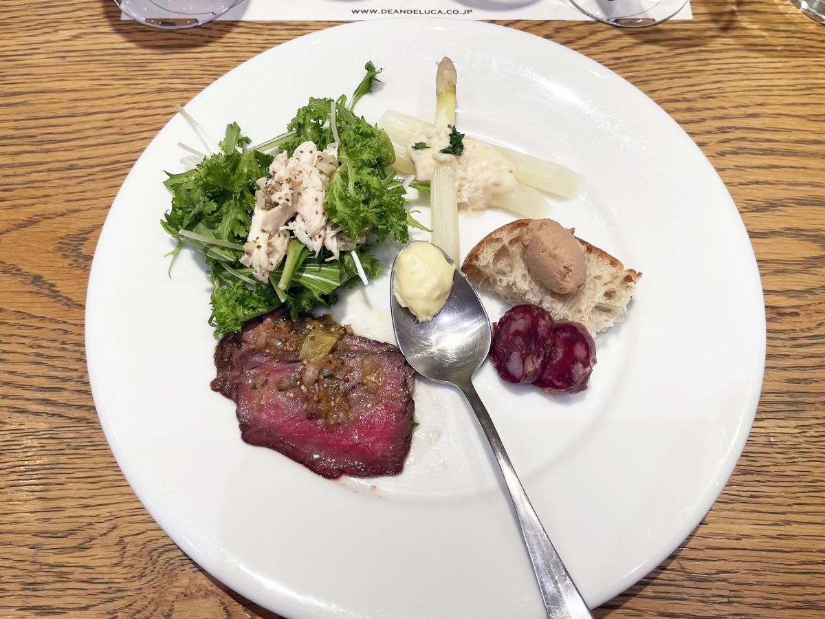 今回は左上から時計回りに、「チキンとわさび菜のサラダ セロリドレッシング」「ホワイトアスパラガスのサラダ ベーコンクリームソース」「フォアグラのパテ」「放牧豚サラミフェンネル」「フランス産名物チーズ・ヴィシュラン モンドール」「国産牛のタリアータ 八朔ラビゴットソース」の6品でした。