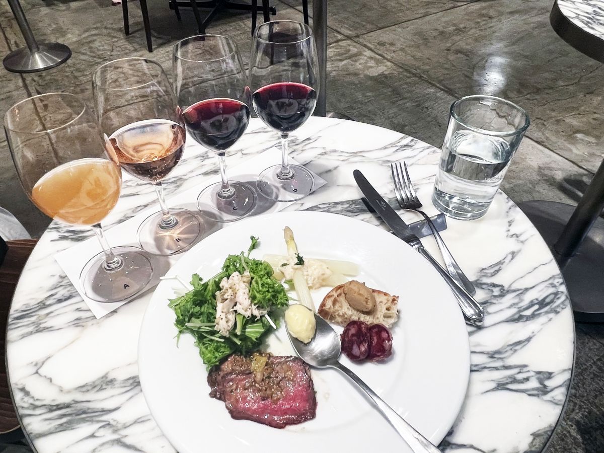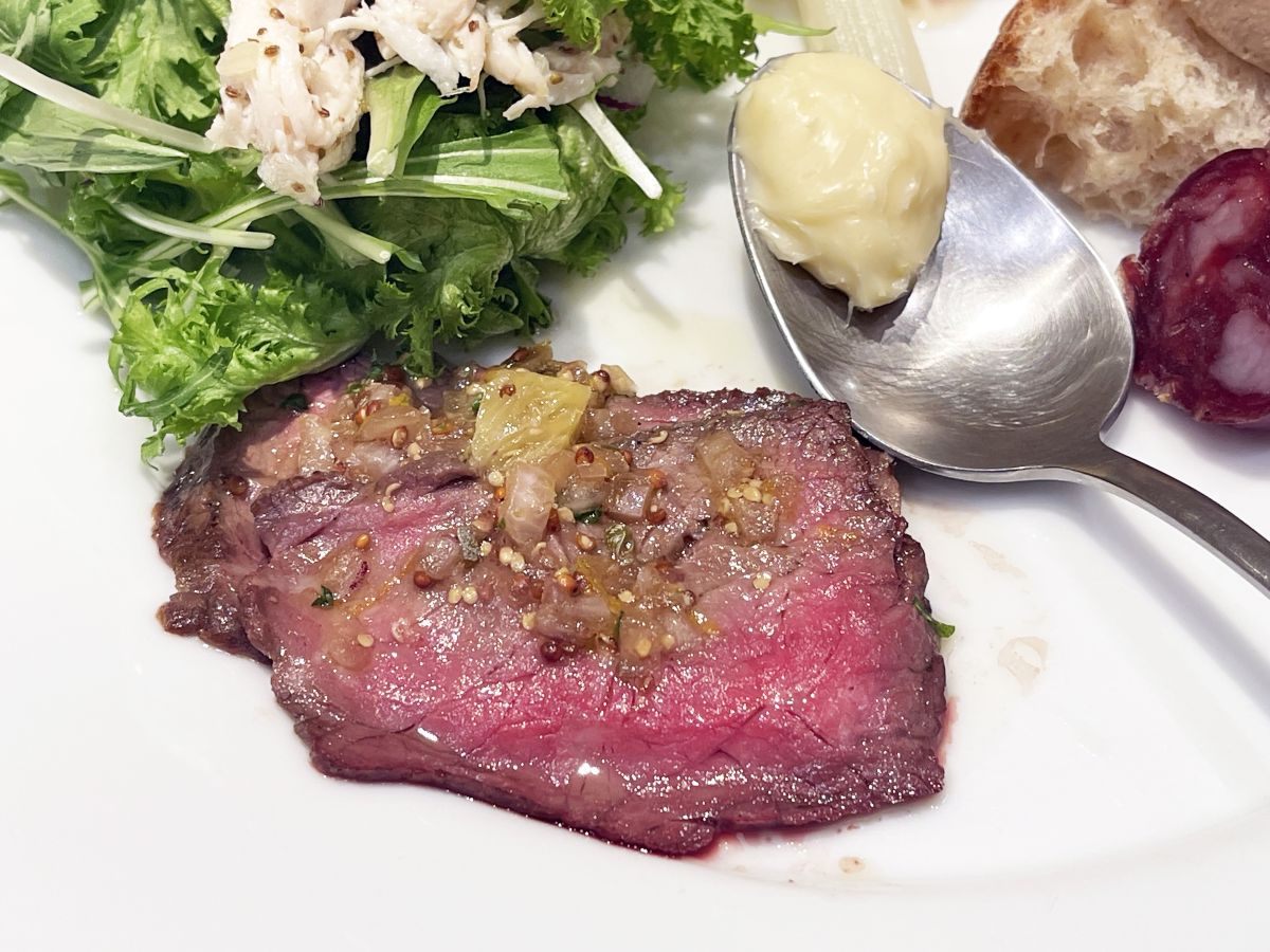 アペタイザーの内容も、「DEAN & DELUCA」のシェフとロドリゲス氏が相談し、ワインのおいしさを引き立てるメニューをセレクトしているそう。今回のアペタイザーの中で特に気に入ったのは、「国産牛のタリアータ 八朔ラビゴットソース」。軟らかくジューシーな牛肉と赤ワインを合わせると、深みが増して肉のうま味が引き立ちます。