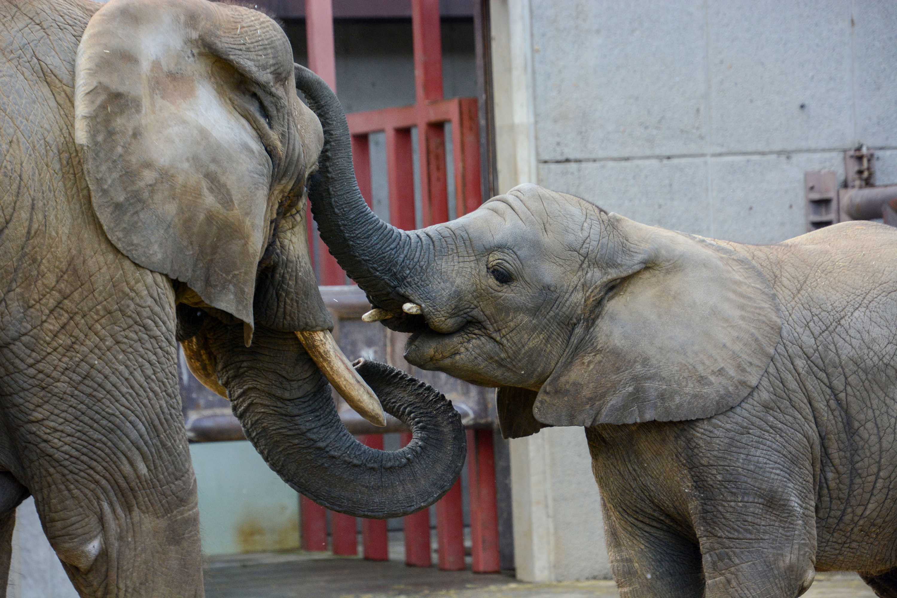 ピースと並ぶ人気者はアフリカゾウの親子、お母さんのリカと、媛&砥愛(とあ)姉妹。実は親子で暮らすアフリカゾウを見られるのは日本ではここだけ。まだまだ甘えん坊の砥愛を中心に仲睦まじく過ごす姿がほっこり暖かい気分にさせてくれる、ほのぼのファミリーです。