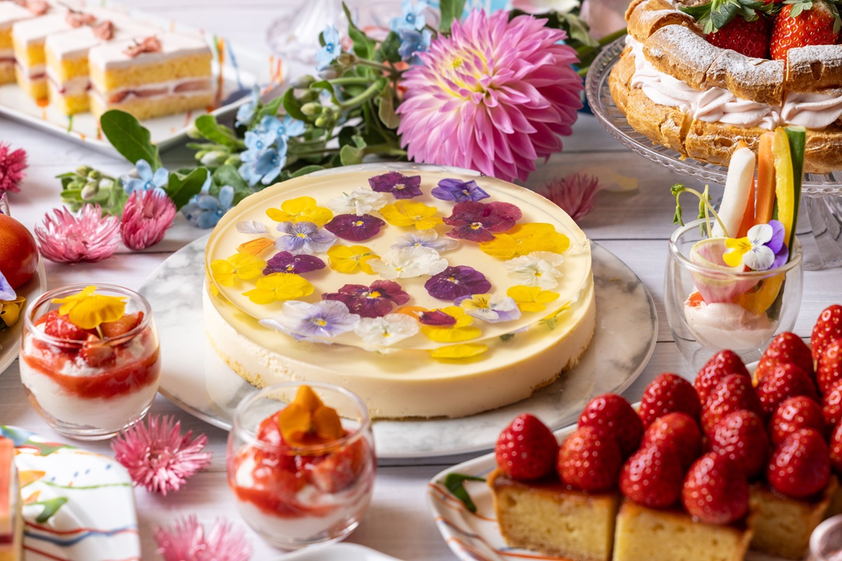 2024年3月1日(金)~4月15日(月)の第1期 “桜&ストロベリー”では、カラフルなエディブルフラワーをゼリーの中にあしらい、バニラムースのトップに飾ったフラワームースケーキや、真っ赤に熟した旬のイチゴをぜいたくにあしらったストロベリータルト、切り絵をイメージした色鮮やかなチョコレートをトッピングしたチョコレートムースなど、『花と果実』のなかでもピンクやイエロー、オレンジをメインにした色彩豊かなスイーツの数々を楽しめます。