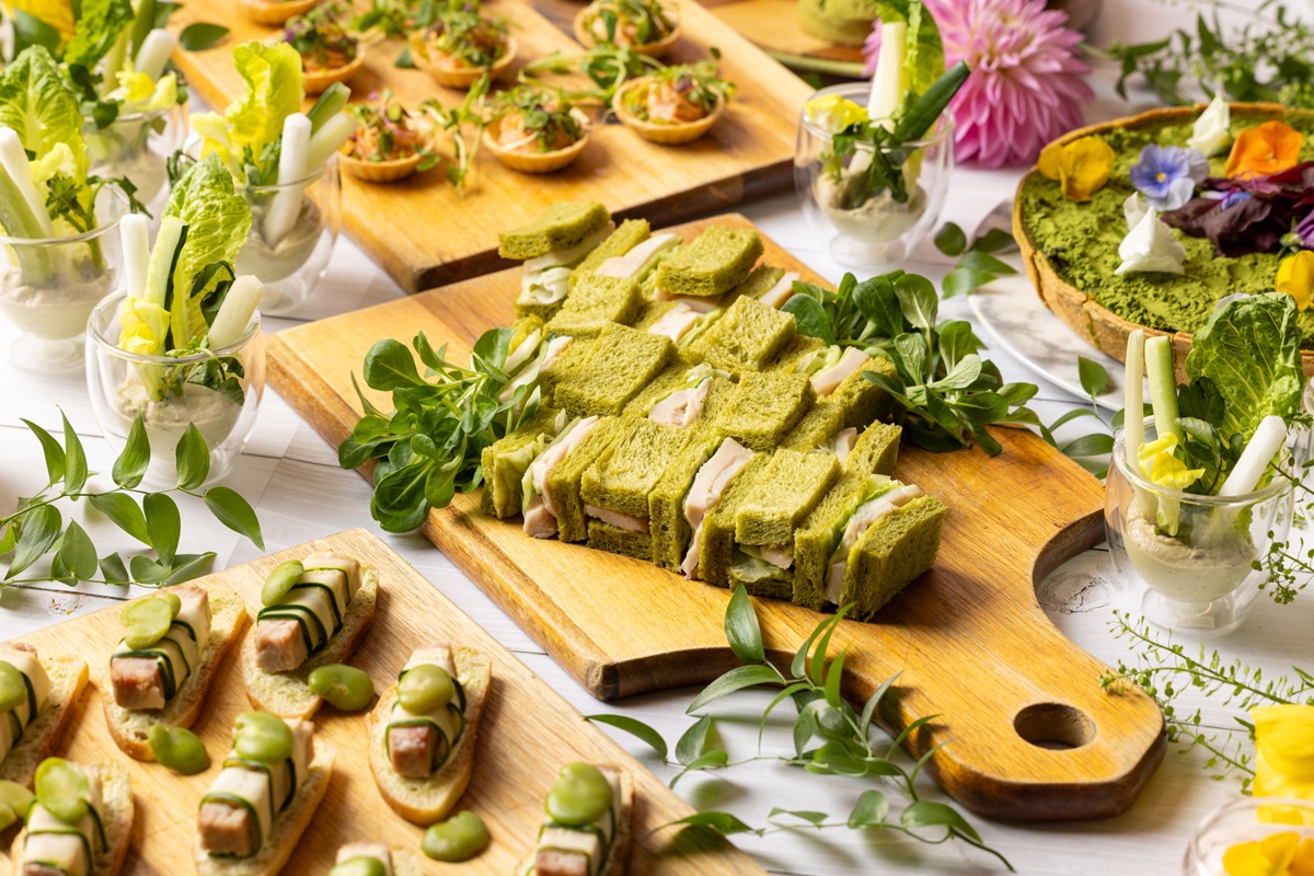 さらに、ほうれん草のピューレに、ソテーしたケールとベーコンを合わせたグリーンキッシュや、自家製のスモークサーモンのムースにクラッシュしたピスタチオをあしらったタルトレット、じっくり低温で調理するしっとりとしたチキンを自家製の抹茶のパンではさみ込んだ抹茶のサンドイッチなど、シェフが趣向を凝らしたグリーンのセイボリー5種が並び、初夏のようなさわやかな彩りがスイーツとセイボリーで表現されます。