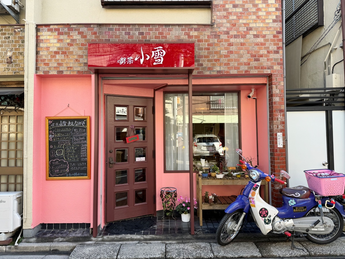 東武鉄道ときわ台駅から歩くこと約8分、住宅街にたたずむ「喫茶小雪」。ピンク色に塗られた壁紙と赤い看板が目印です。