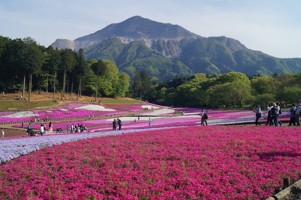 秩父市街地を一望する丘陵にある「羊山公園(ひつじやまこうえん)」は、人気のお花見スポット。ただし、桜は桜でも、ここで見られるのは芝桜です。濃淡入り交じったピンクや白、紫の小花が丘一面を彩り、まるでピンクの絨毯のよう。秩父のシンボルである武甲山とのコントラストも見事です。