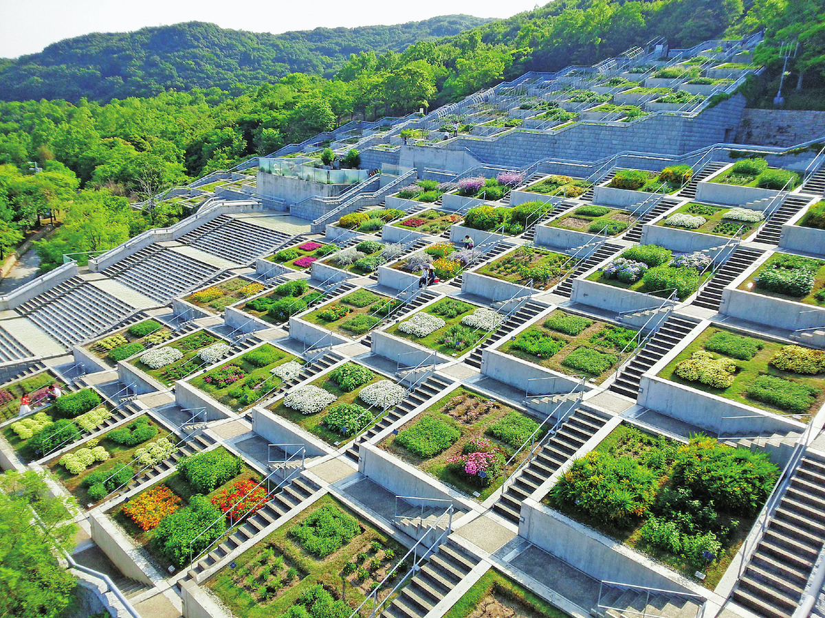 温室やホテル、レストランなどを併設する複合施設「淡路夢舞台(あわじゆめぶたい)」。傾斜地に階段状に造られた百段苑は、日本屈指の建築家・安藤忠雄氏によるもの。2~6月はデイジー、3~6月はマーガレット、5~8月はマリーゴールド、6~8月はオトメギク、7~9月はヒマワリ、9~11月はコスモス、ダリア、12~5月はキンセンカが見ごろになります。
