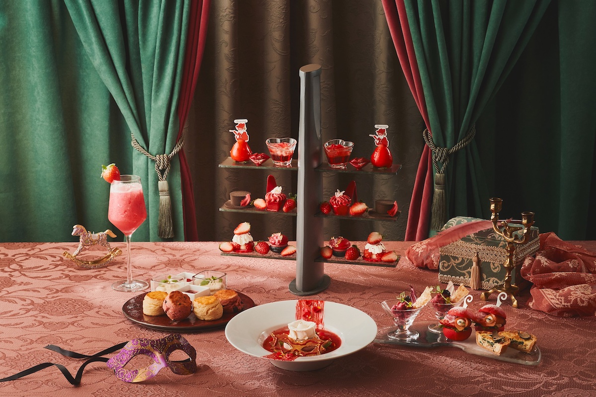 「Strawberry Afternoon Tea ~Red Masquerade~」は、仮面舞踏会(マスカレード)の秘めやかな雰囲気が漂うイチゴのアフタヌーンティー。ティースタンドには仮面舞踏会の貴族から連想した7種類のスイーツが並ぶほか、3種類のセイボリー、2種類のスコーンもラインアップ。