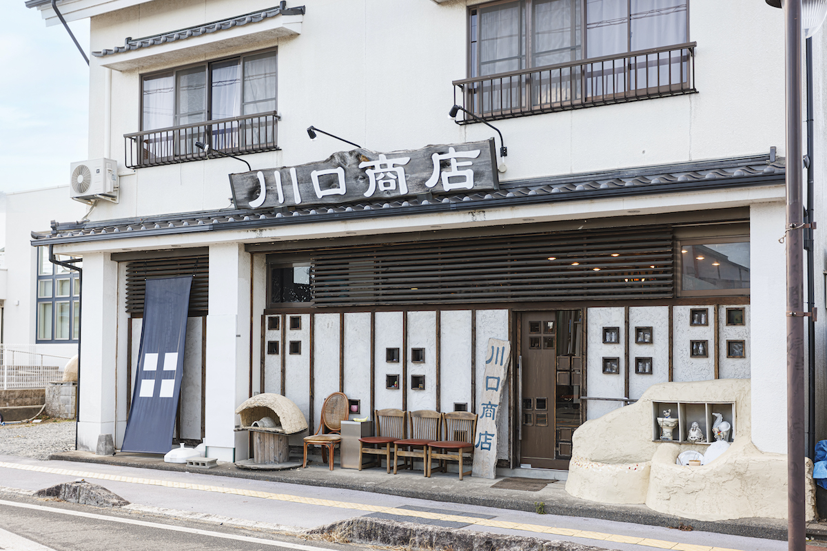 JR常磐線原ノ町駅から車で約5分の「川口商店」は、地元の食材をふんだんに使った創作料理が味わえるお店。東日本大震災以前は相馬野馬追の馬の飼料も扱っていたお米屋さんで、日除け暖簾の模様や小さな四角窓は、漢字の米を模しています。