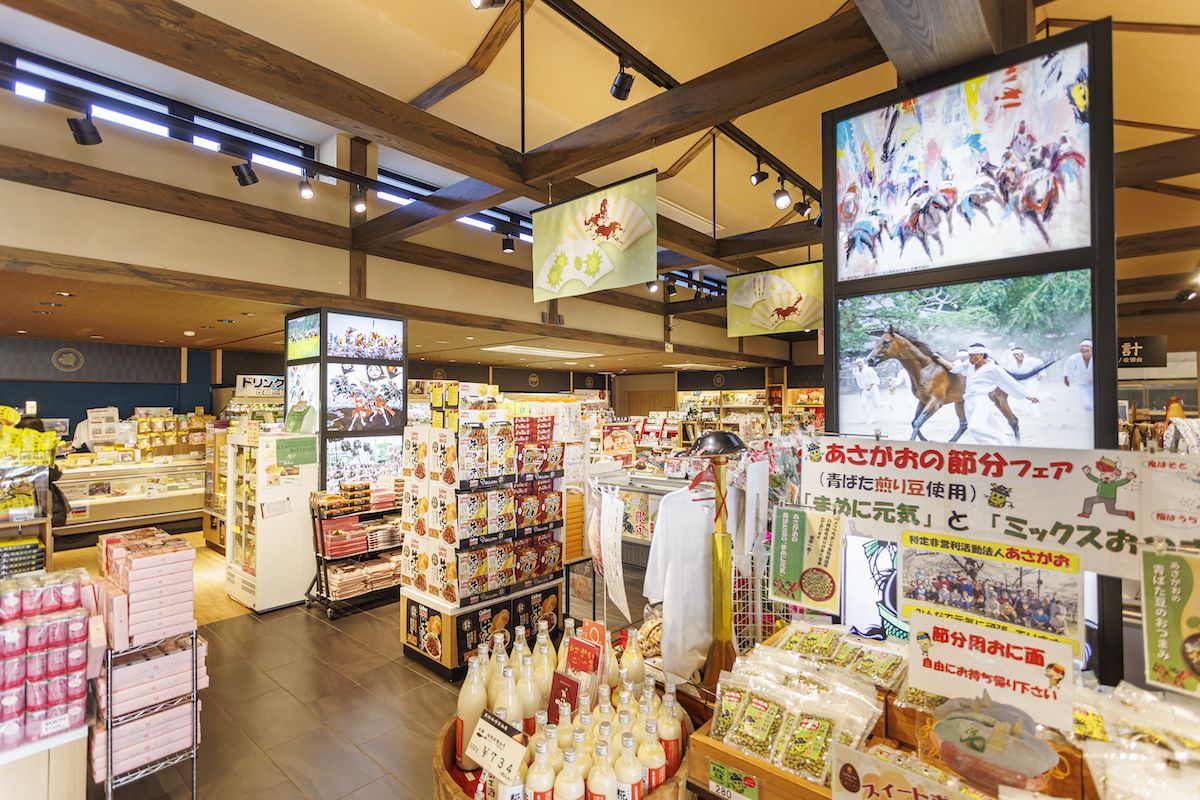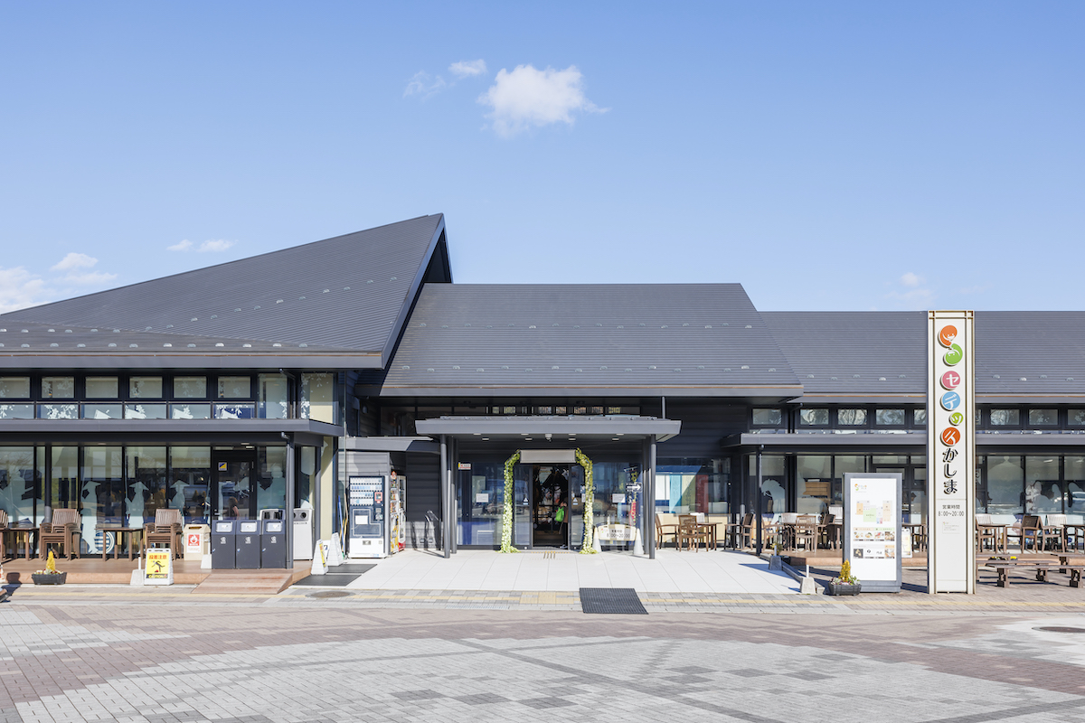 常磐自動車道南相馬鹿島SAに隣接し、一般道からもアクセスできる「セデッテかしま」。セデッテは「連れて行って」という相馬地方の方言で、食事処やおみやげ処、無料のドッグランがあり、ドライブ休憩にぴったりのスポットです。シックな黒い外観は、相馬野馬追の騎馬武者の鎧や兜をイメージしたもので、ロビーでも映像やディスプレイで相馬野馬追を紹介しています。