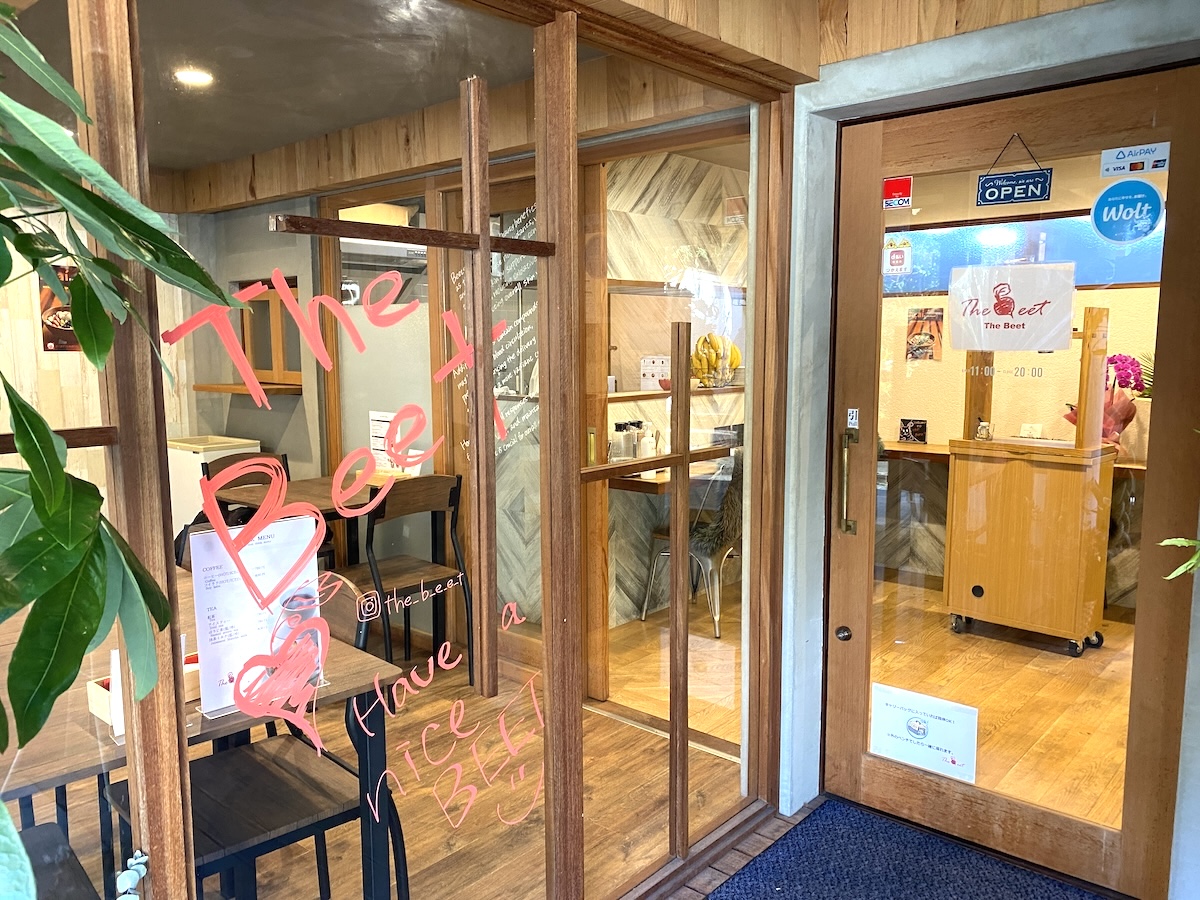 JR原宿駅表参道口からおよそ徒歩9分。原宿キャットストリートから少し入った閑静な路地裏にあるのが、2023年12月にオープンしたばかりのビーツ専門店「The Beet」です。入り口の窓ガラスに描かれた店名とビーツの絵が目印!