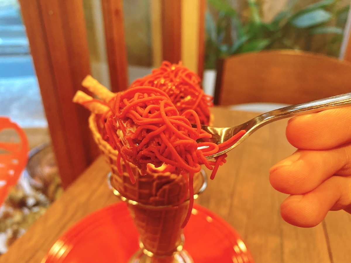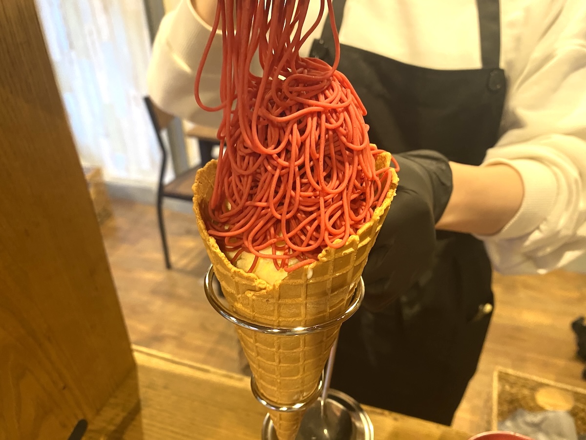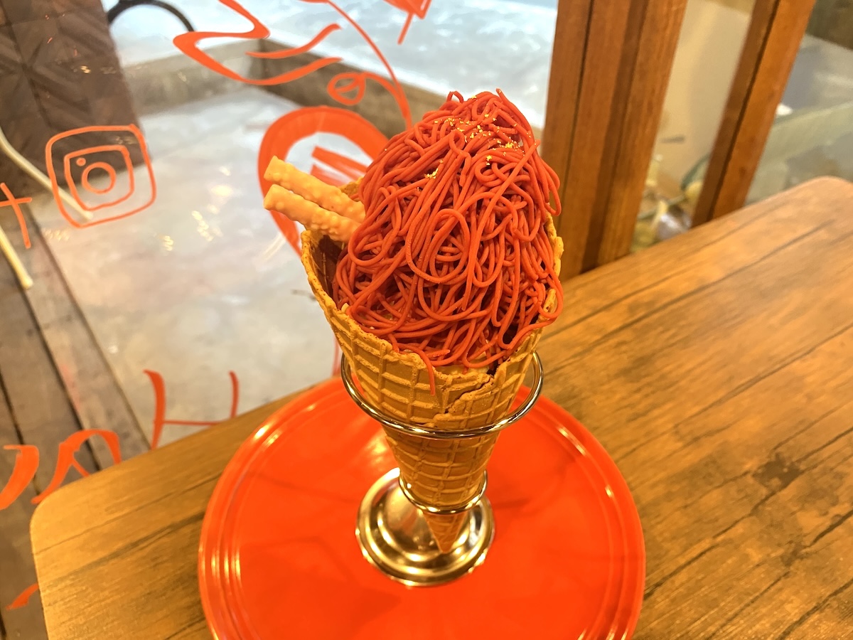 なかでもおすすめなのが「ワッフルコーンモンブラン」1280円。取材時はワッフルコーンに紅茶風味のマスカルポーネクリーム、チョコレートクランチ、イチゴ大福、バニラアイスを入れ、トップにビーツパウダーを加えた栗ペーストと金箔がトッピングされており、ボリュームたっぷりでした。