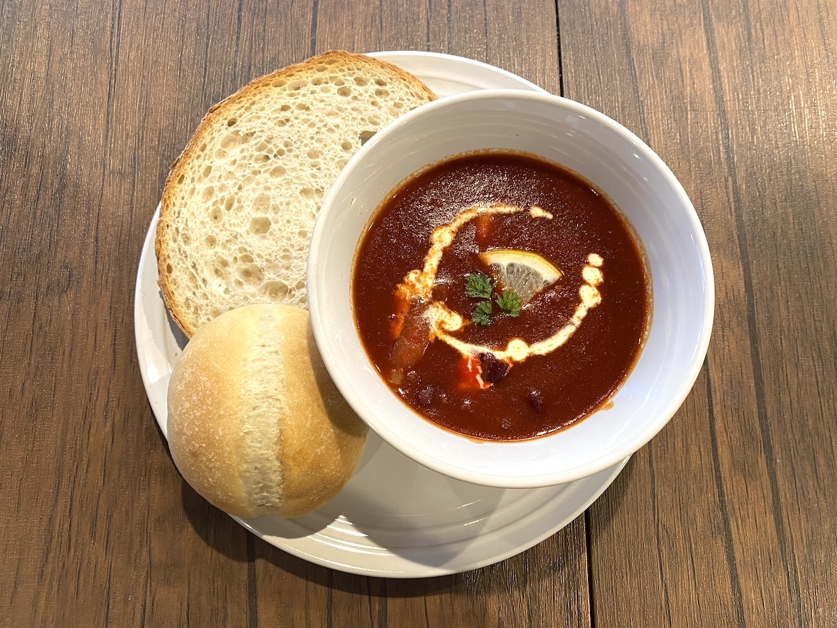 「ボルシチ」1080円は、日本人の口に合うよう工夫されたトマトベースのボルシチ。ビーツをはじめ、ニンジンやジャガイモ、キドニビーンズなどの野菜や豆を入れ、食感を感じられるようあえてさらっと煮込んでいます。付け合わせに石窯で焼いたもちもちとかための2種類の食感のパンがついているのもうれしいポイント!テイクアウトもできますよ。