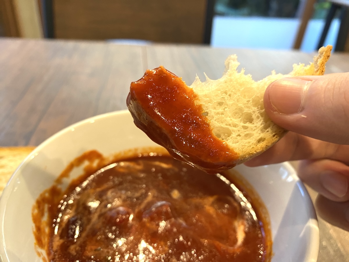 丁寧に調理されているため、ビーツ独特の香りも比較的抑えられていて食べやすく、ごろごろと入った野菜のさまざまな食感と味わいにうっとり。パンにたっぷりとルーをつけて楽しむのがおすすめです。体が温まってリラックスできるのでぜひオーダーしてみて。