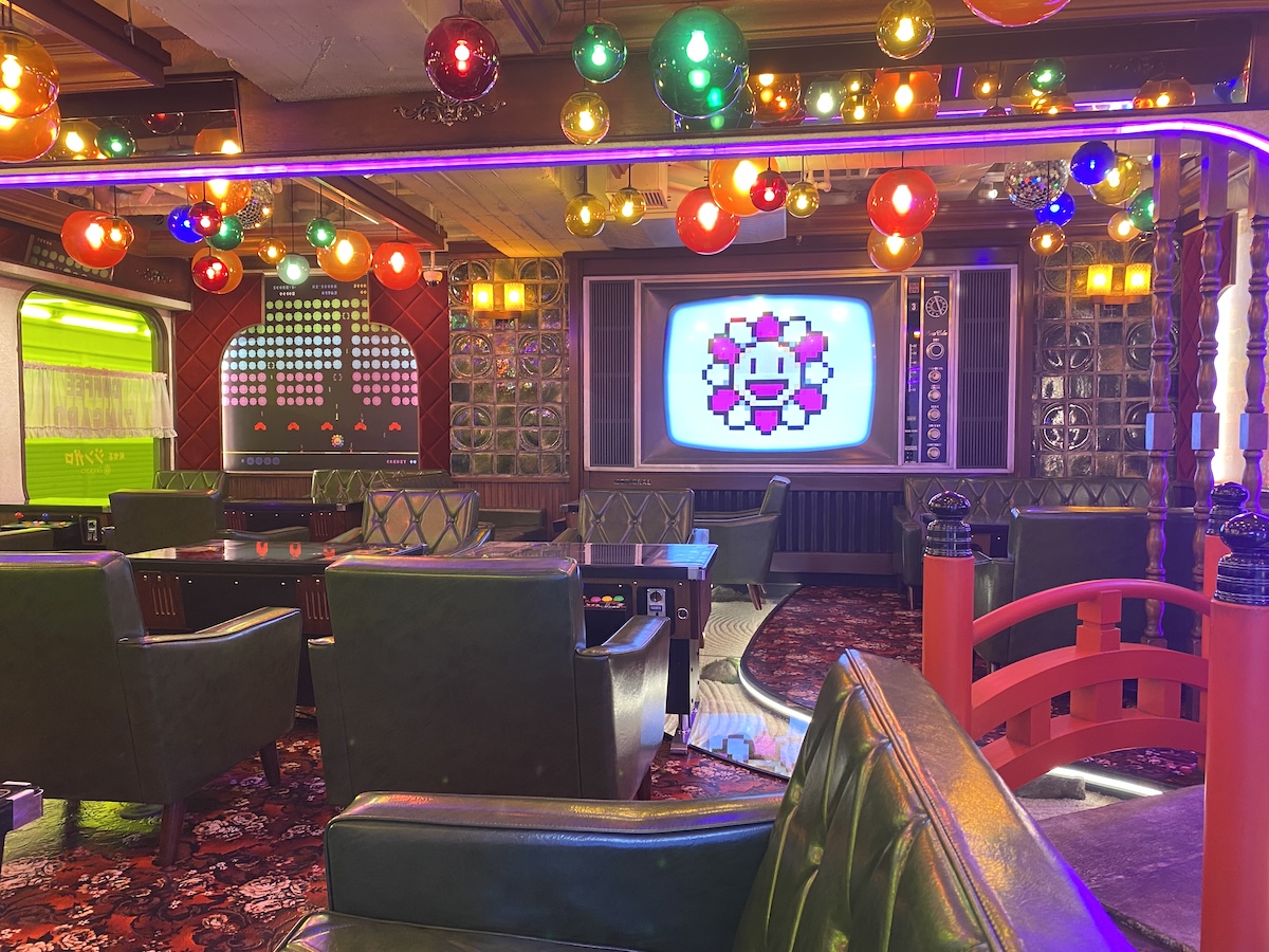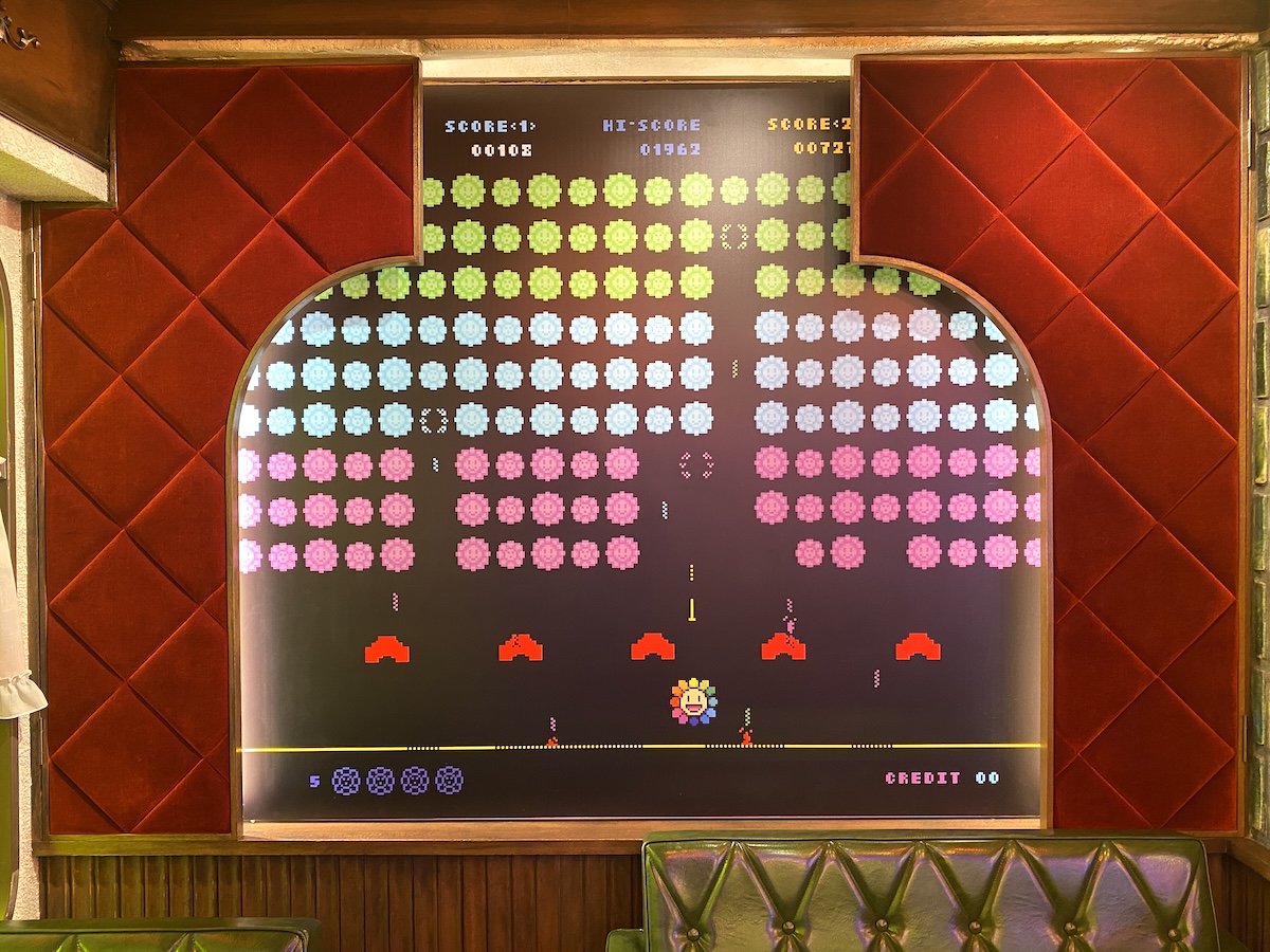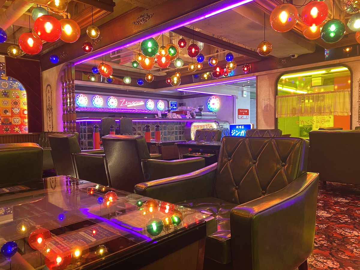 純喫茶をテーマにしていて、ブラウン管テレビモチーフのディスプレイや花柄のカーペットなど至る所で感じられるレトロっぽさが魅力です。