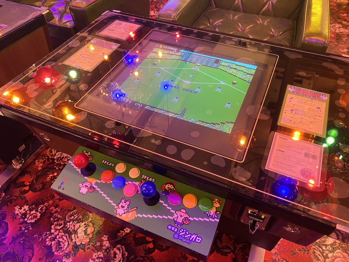 テーブル席はすべて懐かしいゲームテーブルになっていて、専用のお花コイン(500円)を買えば実際にプレイも可能。席ごとにゲームはすべて異なるので、足を運ぶたびに違った楽しさを体験してみて。