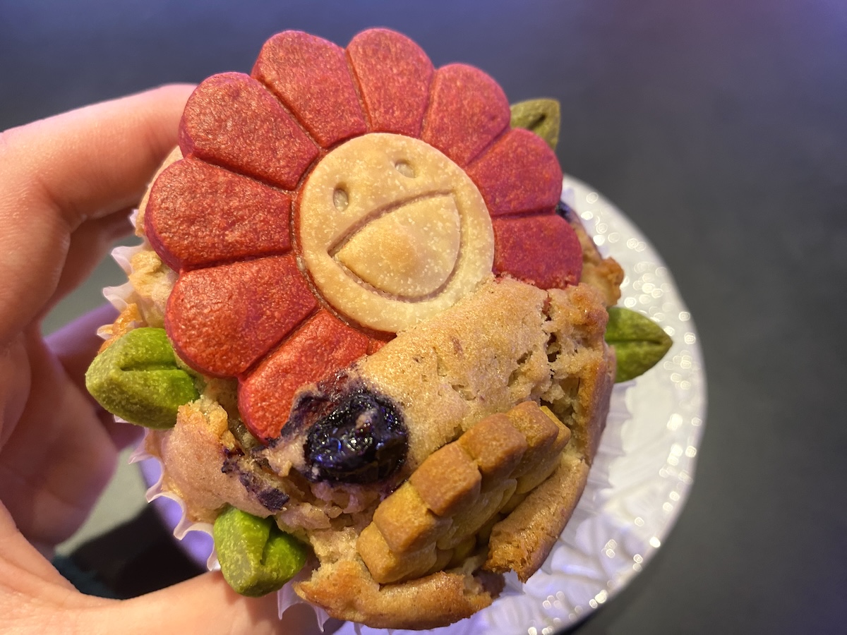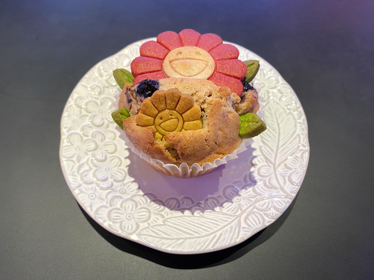 村上氏のお花をモチーフにしたクッキーが生地に練り込まれてたマフィンで、毎朝お店で焼き上げているそうです。味はバナナブルーベリー、カボチャ、さつまいも、アールグレイの全4種類で、マフィンの生地だけでなく、クッキーもひとつひとつ味が違うのがポイント!今回は「バナナブルーベリーマフィン」を注文しました。