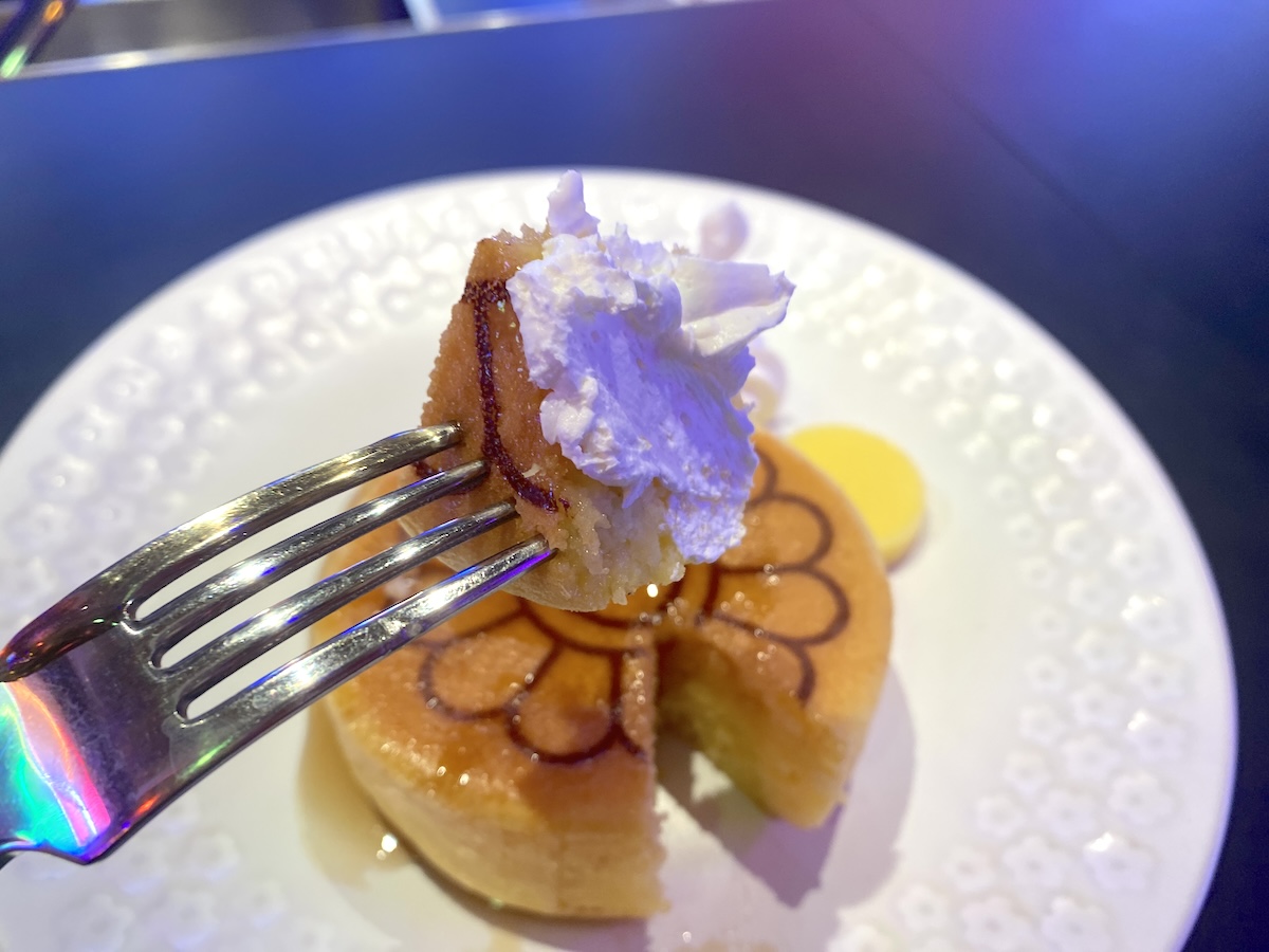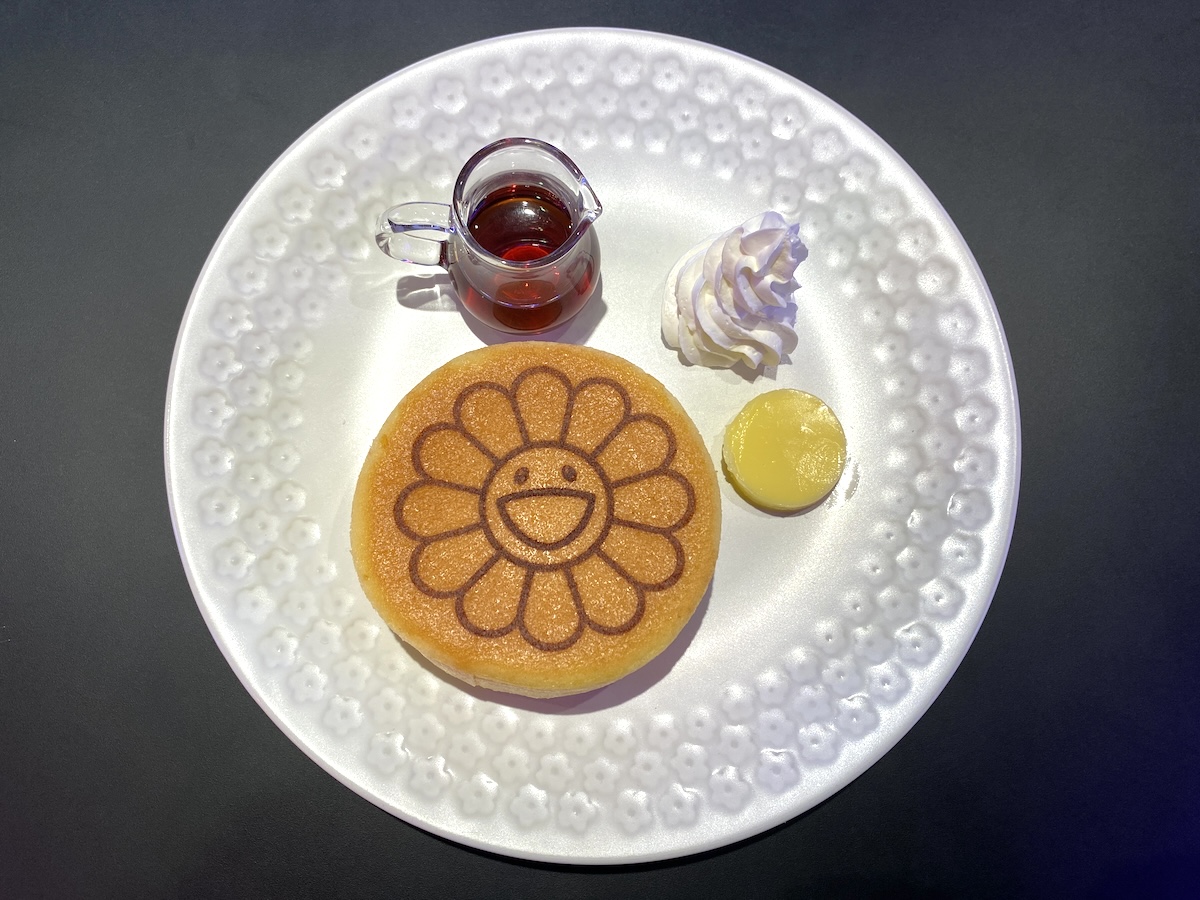 「お花パンケーキ」1200円は、カイカイキキの製菓ブランド「となりの開花堂」のパティシエが開発した自家製のパンケーキ。米粉とヨーグルトを使用しているので、もちもちかつふんわりとした食感を楽しめます。