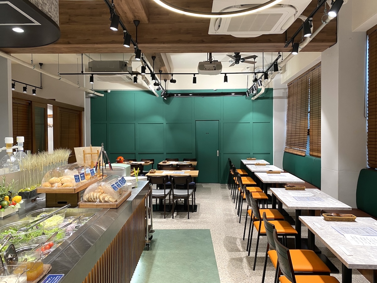 オーブンの中をイメージして作られた厨房は、スタッフが調理している姿を見られるためライブ感を感じられます。厨房の前には、食べ放題で楽しめるパンのほか、サラダバーやドリンクバーがずらり。注文する前から「あれ食べたい、これ食べたい」とワクワクしちゃいます!
