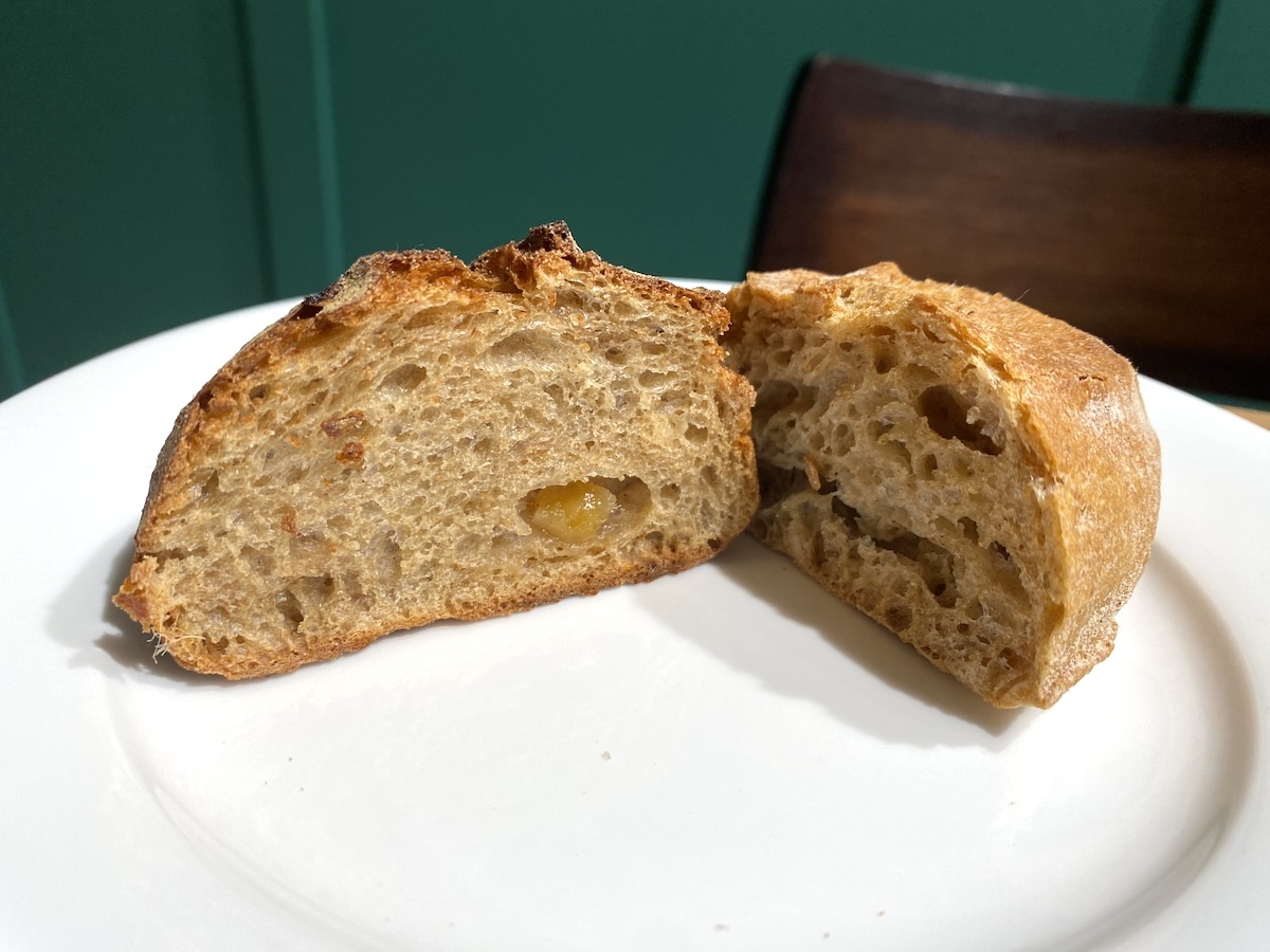 「リュスティック」はキタノカオリを使用した手ごねのフランスパン。生地を手で合わせることで硬さともちもち感が生まれていて、食べ応えのある仕上がりになっています。中に入っているレーズンの甘さがポイントです。