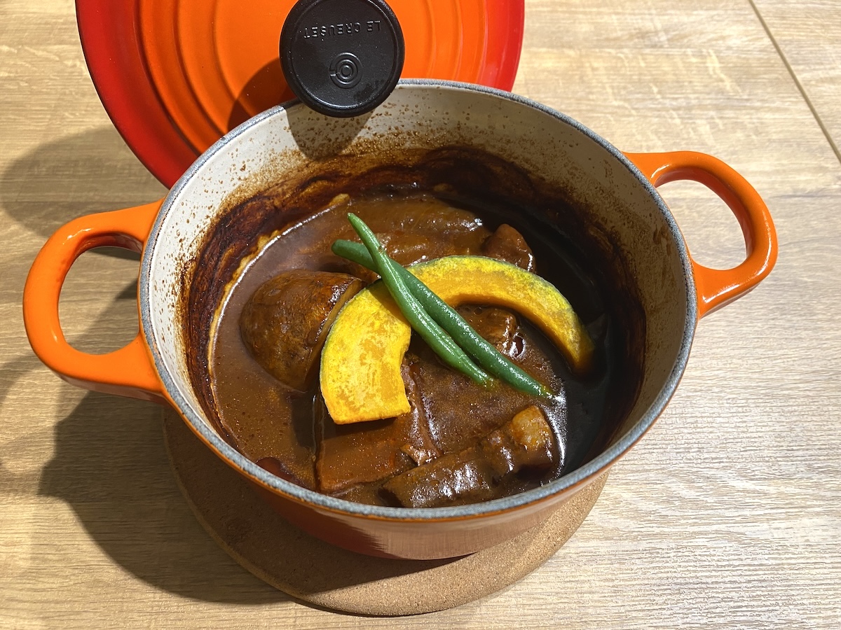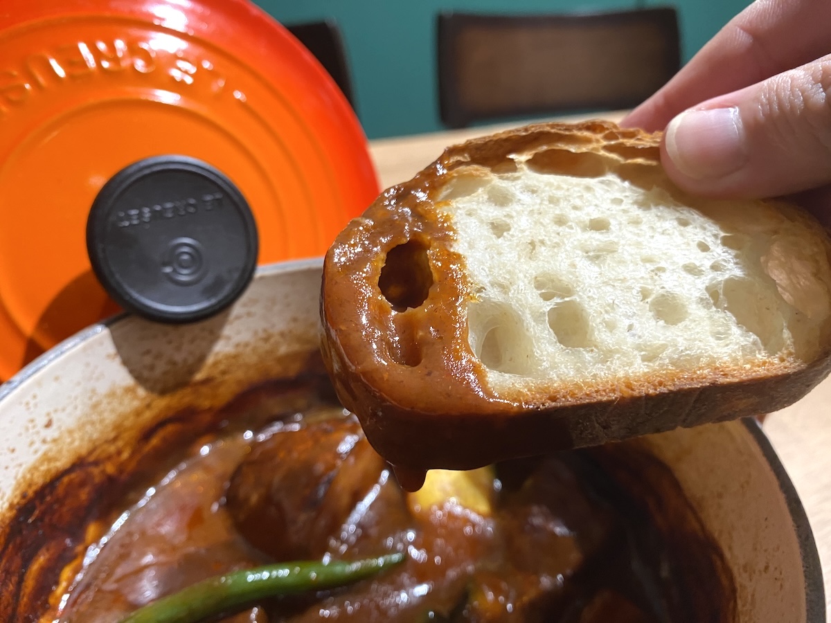 デミグラスベースのシチューに野菜やお肉のうま味がにじみ出ていて、次から次へとパンをつかむ手が止まらない、やみつきになってしまう味わいです。長時間調理しているため野菜やお肉がほろほろとやわらかくて、ルーだけでも楽しめます。