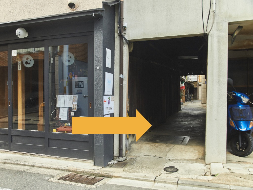 四条通と富小路通の交差点を南に下り、綾小路通を過ぎて50mほど。右手を気にして歩いていると、狭い路地への小さな入り口が見つかります。