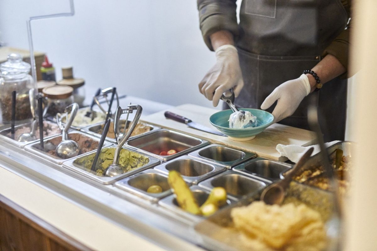 カウンターのバットに並ぶのは、プレーン・ブルーベリー・ミルクティー・チョコレートの4種類のギリシャヨーグルトとコームハニー、ココナッツチップス、ロータスクッキー、オレオの4種類のトッピング。ヨーグルトの見た目はまるでアイス。ディッシャーで力をこめてぐいっとすくう様子もアイスをすくっているかのようです。