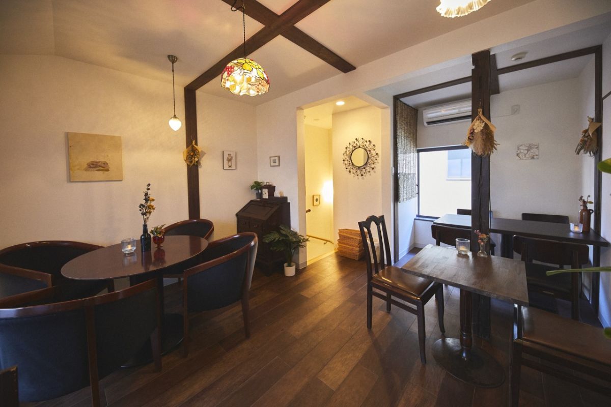 イートインスペースの2階は、白い壁に床色や柱、家具をダークブラウンに揃えた落ち着いた印象のインテリア。外灯と同じく、室内の照明もアンティークなカットガラスのペンダントライト。