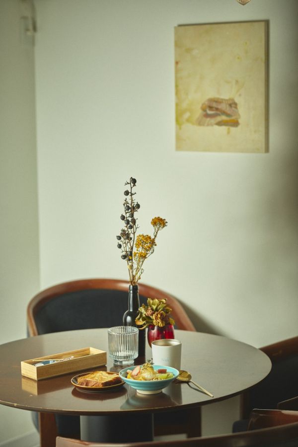 テーブルの花瓶にはドライフラワー、壁には小さなサイズの絵画が飾られて品のいい空間です。