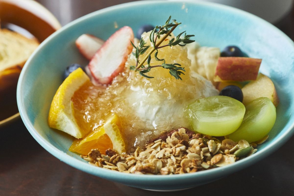 自家製のプレーンヨーグルトに、店で焙ったシリアルとカットフルーツを飾り、仕上げにたっぷりの巣蜜をのせます。