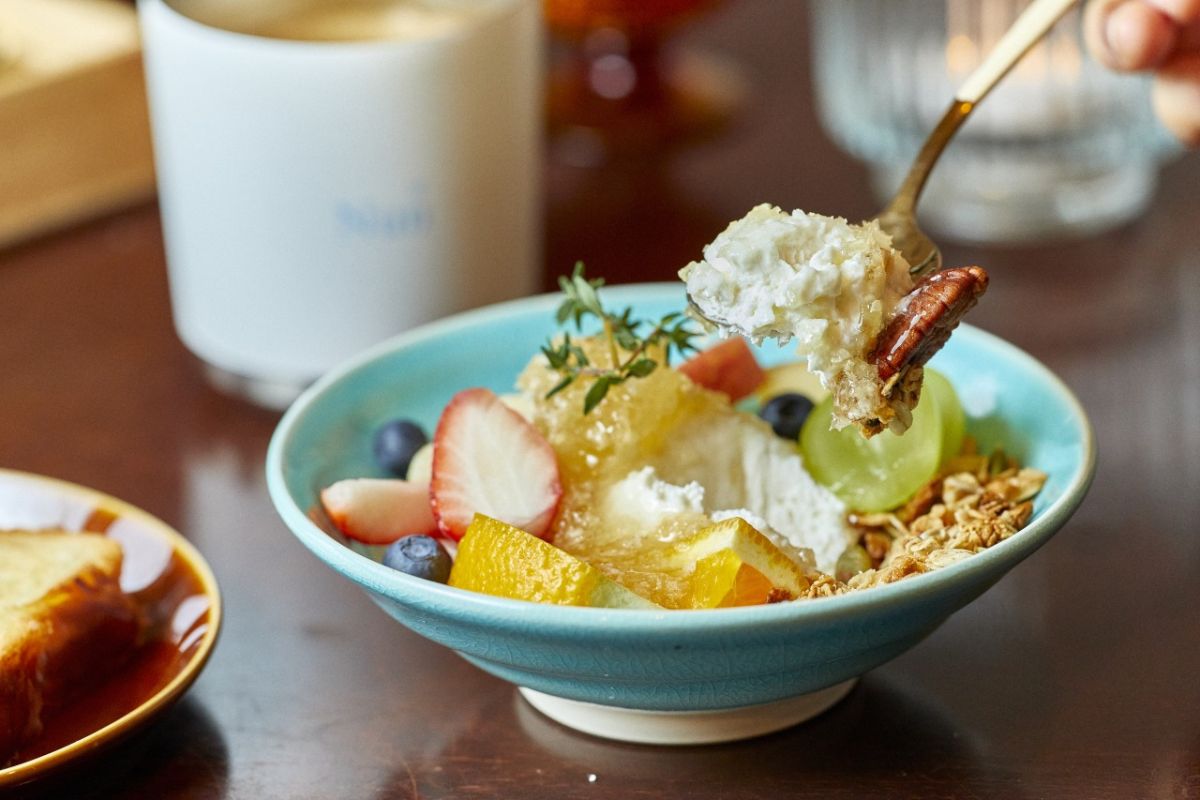 そして、ギリシャヨーグルトはというと、すくっても落ちない濃厚な硬さです。この「Nun」特製プレーンヨーグルトの材料は牛乳のみ。何種類もの牛乳でトライアンドエラーを繰り返して、ようやく理想の味に巡り会えたとのことで、どんな牛乳を使っているのかは企業秘密。あえていうと、フルーツや巣蜜の味を際立たせるために酸味の出にくいものを選んでいるそう。