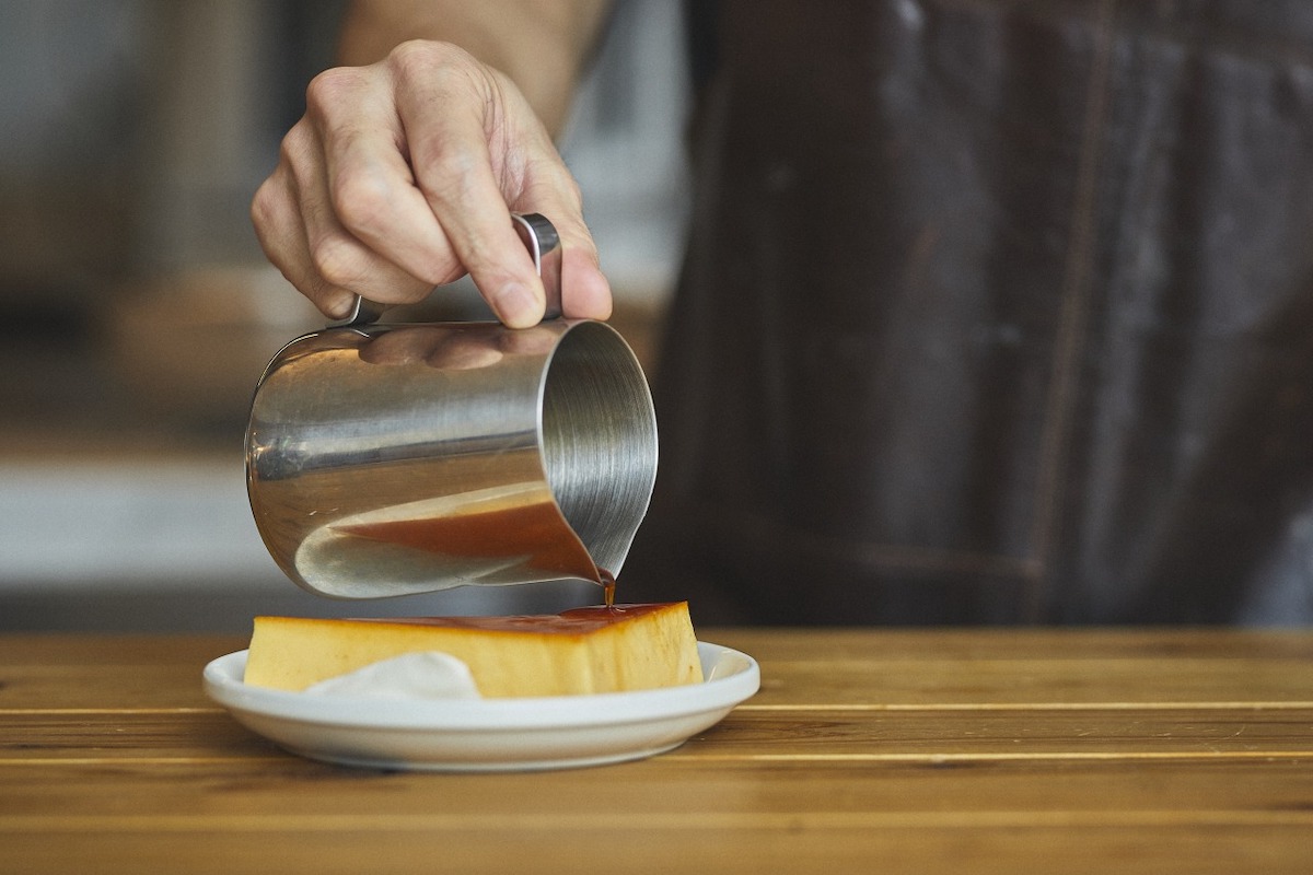 四角いバットで焼き上げた昔ながらの焼きプリンに、カラメルソースをたらりとかけて仕上げます。