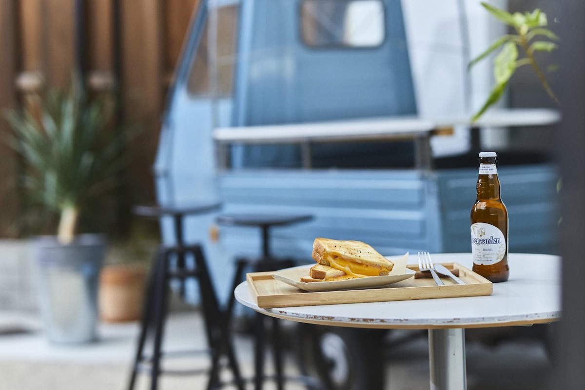 晴れた日の太陽の下で飲むビールは最高です。ビールのお供はホットな「NYグリルドチーズサンド」。