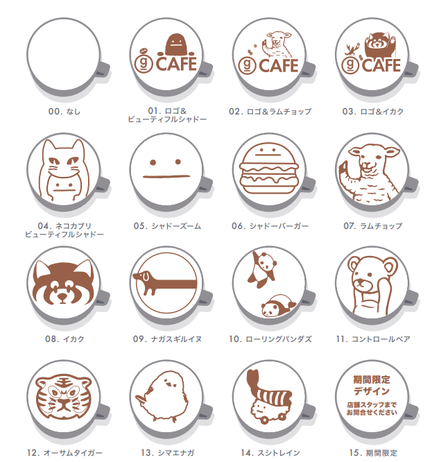 「グラニフカフェ」の名物といえば、オリジナルキャラクターのアートが楽しめる「グラフィックラテ」。全15種類からお気に入りのアートが選べるんです。