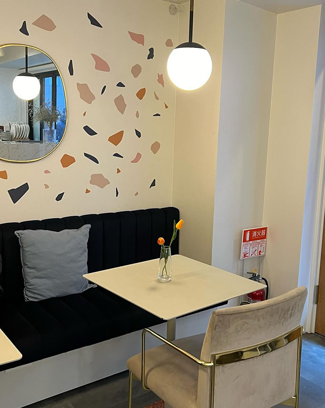 白と赤で揃えられた食器と白いレンガの壁に、ウッド調のテーブル&チェアのナチュラルさが合わさり、韓国っぽい雰囲気の店内です。