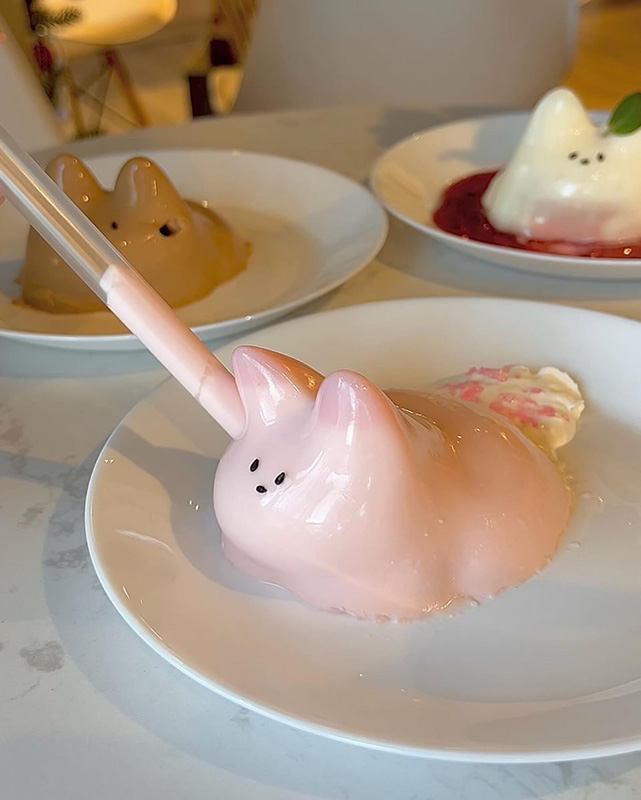 「Studio Cafe MARU」で話題なのは、最近流行中の「猫プリン」。それぞれ少しずつ表情も違い、サーブされた瞬間にSNS映え確定です。お皿を揺らすと、ぷるぷると揺れる姿を見ることができます♪