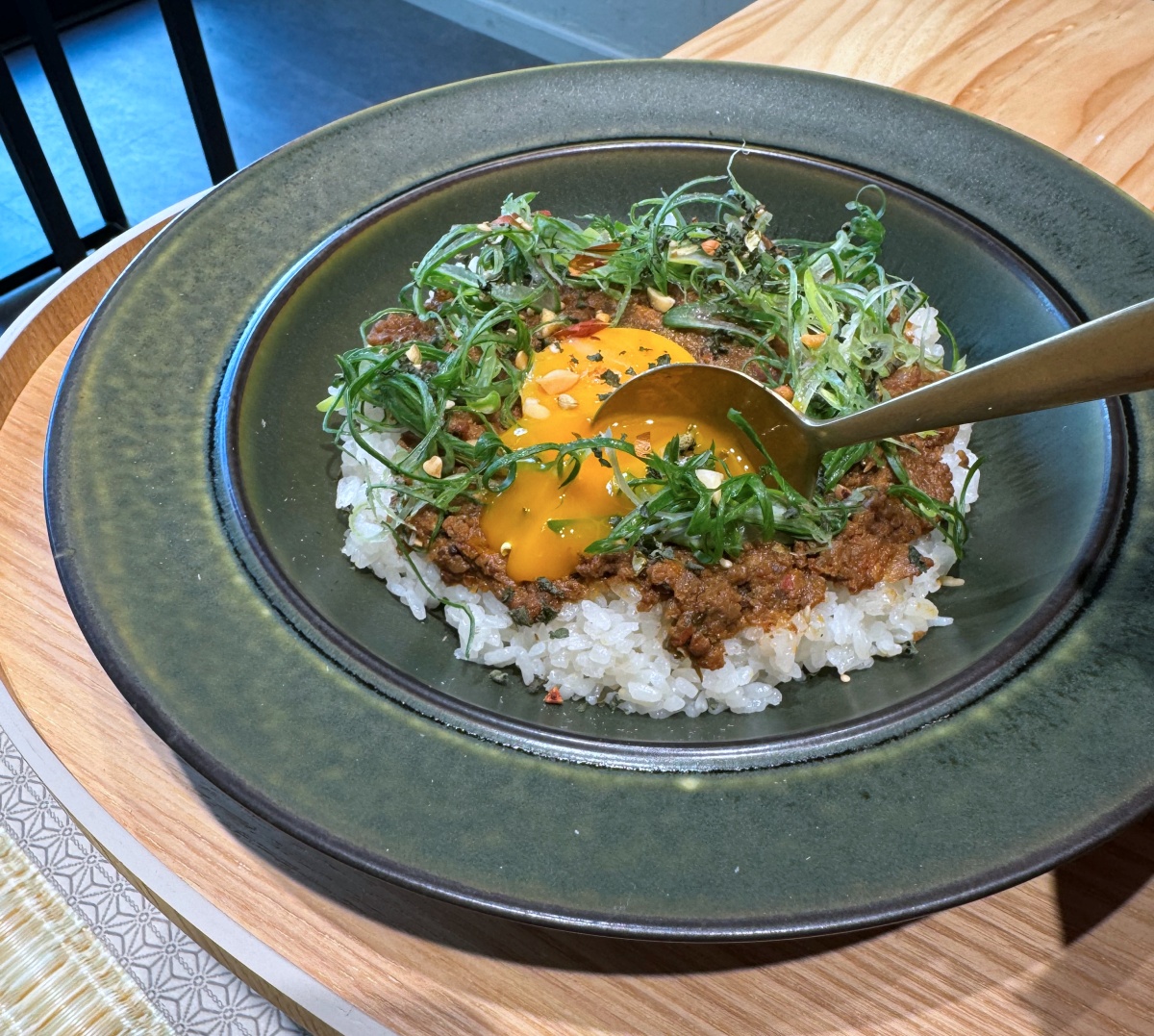 「和ドライカレー」は、昆布だしで炊いたごはんの上に合挽肉と細かく刻んだゴボウを合わせ、かつおだしでしっとりと仕上げたドライカレー、さらにフレッシュなネギと卵黄、山椒・ゴマ・青のりなどが入った特製調味料“和風デュカ”がトッピングされた一品。