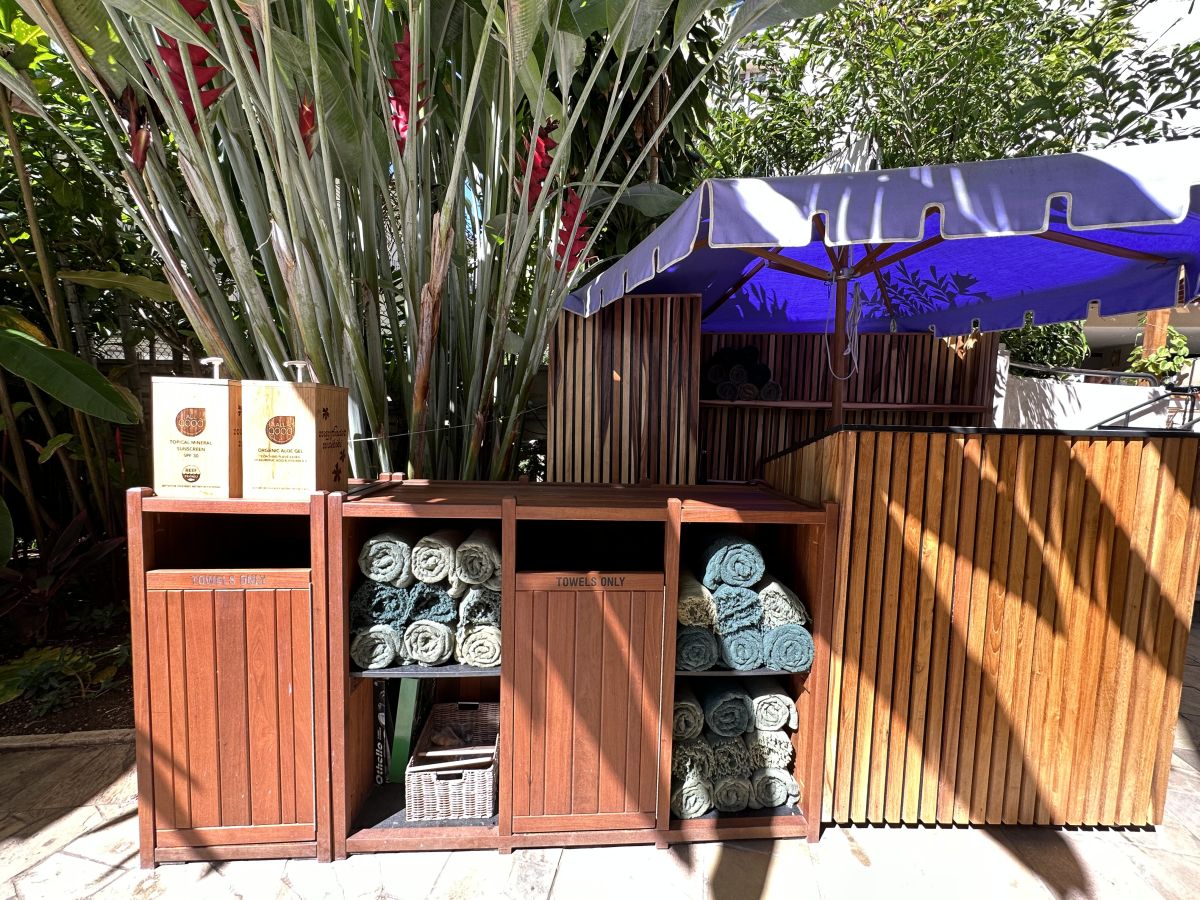 プールの入口には、タオル、サンゴ礁に優しい日焼け止め(SPF30)や、オーガニックなアロエジェルがあります。アロエジェルは、日焼け後の保湿ケアに最適。ホテルで用意してもらえるのはうれしいおもてなし。