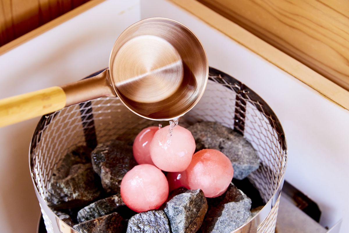 サウナ内にはパッションフルーツが⾹るアロマウォーターを凍らせたオリジナルキューゲルも用意。好きなタイミングでサウナストーンの上に置き、セルフロウリュが楽しめます。