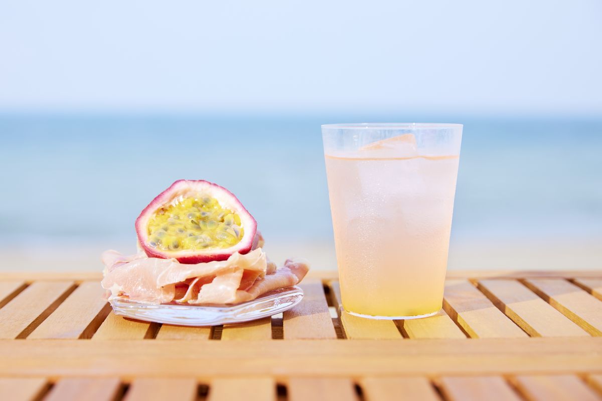 ⼀連のサウナ体験を終えたら、生ハムと旬のパッションフルーツの丸ごとサラダやモクテルを堪能。