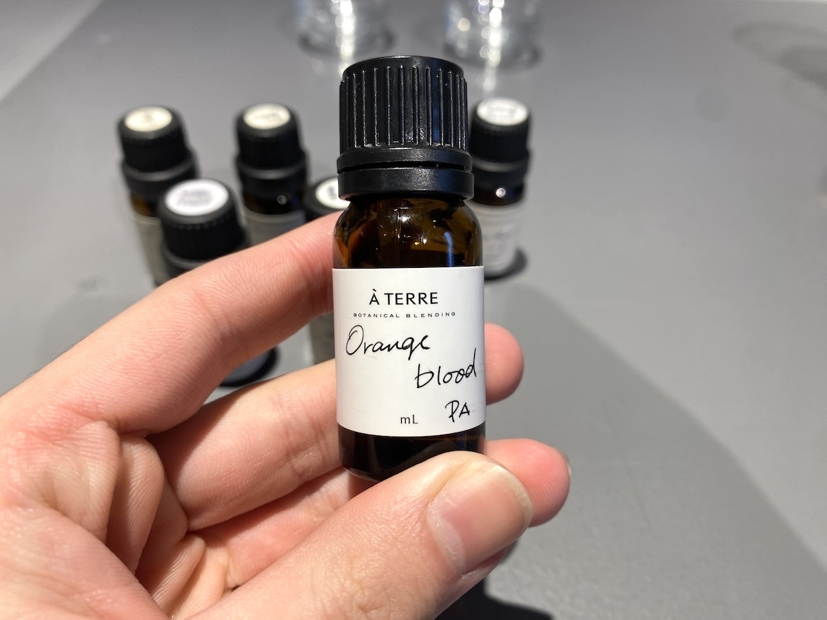 精油それぞれの特徴と働きを聞きながらひとつずつ試した結果、特に好みの香りだったオレンジブラッドの精油をチョイス。これで基本が決まったので、次は合わせる香りを選んでいきます。
