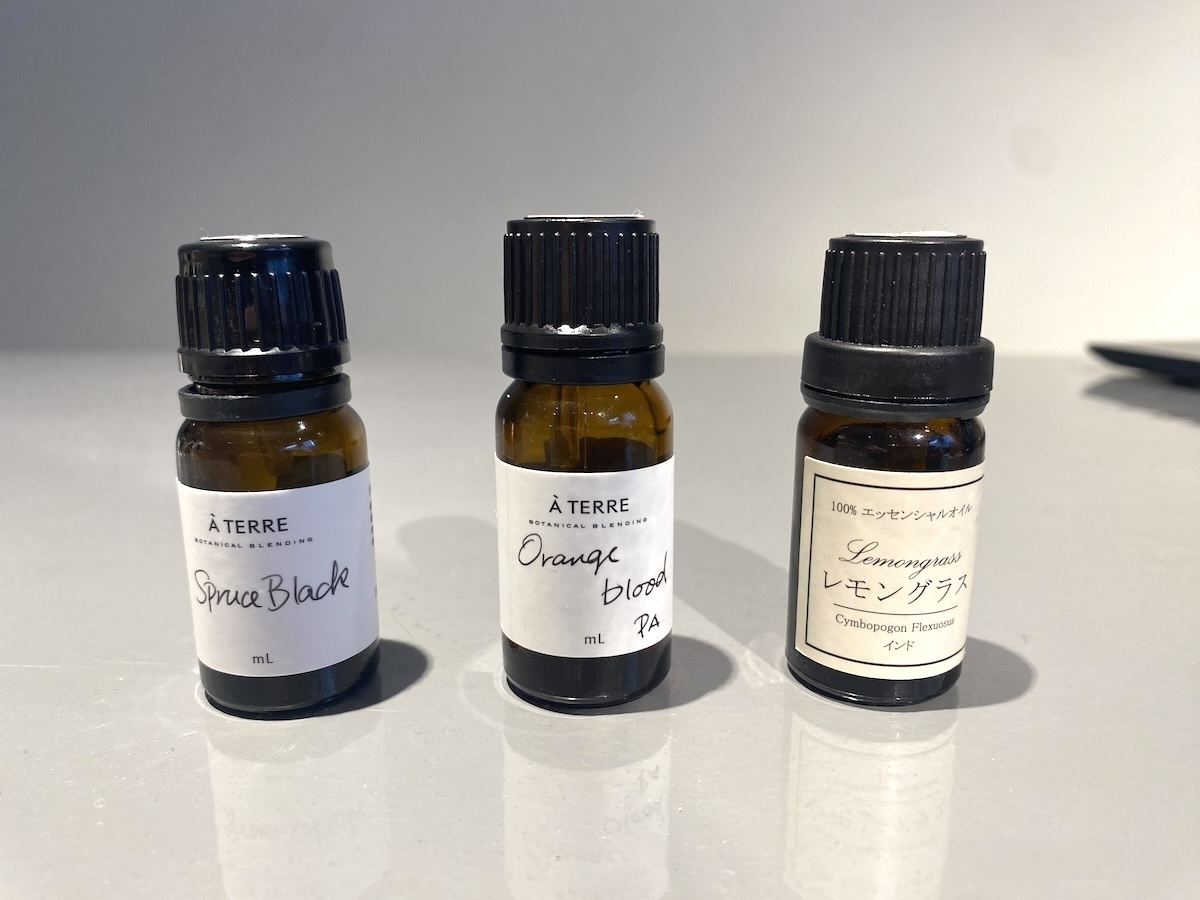 精油はいくつ組み合わせてもいいらしく、10以上組み合わせる人もいるそう。あたたかいボタニカル系や甘いフローラル系を合わせてみたりしましたが、うーん…と納得いかず。そのほかさまざまな組み合わせを試してたどり着いたのが、オレンジブラッド、レモングラス、スプルースブラックの3つ。柑橘類とグリーンのさわやかさをイメージして、数も3つに抑えてシンプルに仕上げました。