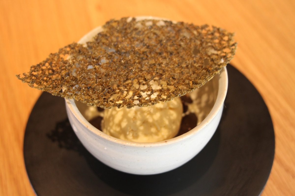 定番デザートの「わらび餅」1000円は、練りたてがいただけるのがうれしいポイント。薄く焼き上げたほうじ茶味のチュイールがトッピングされていて、チュイールをザクザクとスプーンでつぶし、バニラアイスクリーム、わらび餅と一緒にいただきます。