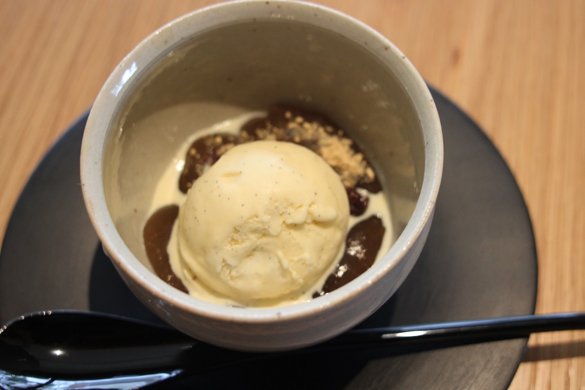 口に入れた瞬間に、ほうじ茶の香りが広がり、もちもち、ぷるんとした食感のわらび餅と絶妙にマッチ。冷たいアイスクリームがよいアクセントになり、最後までおいしくいただけます。